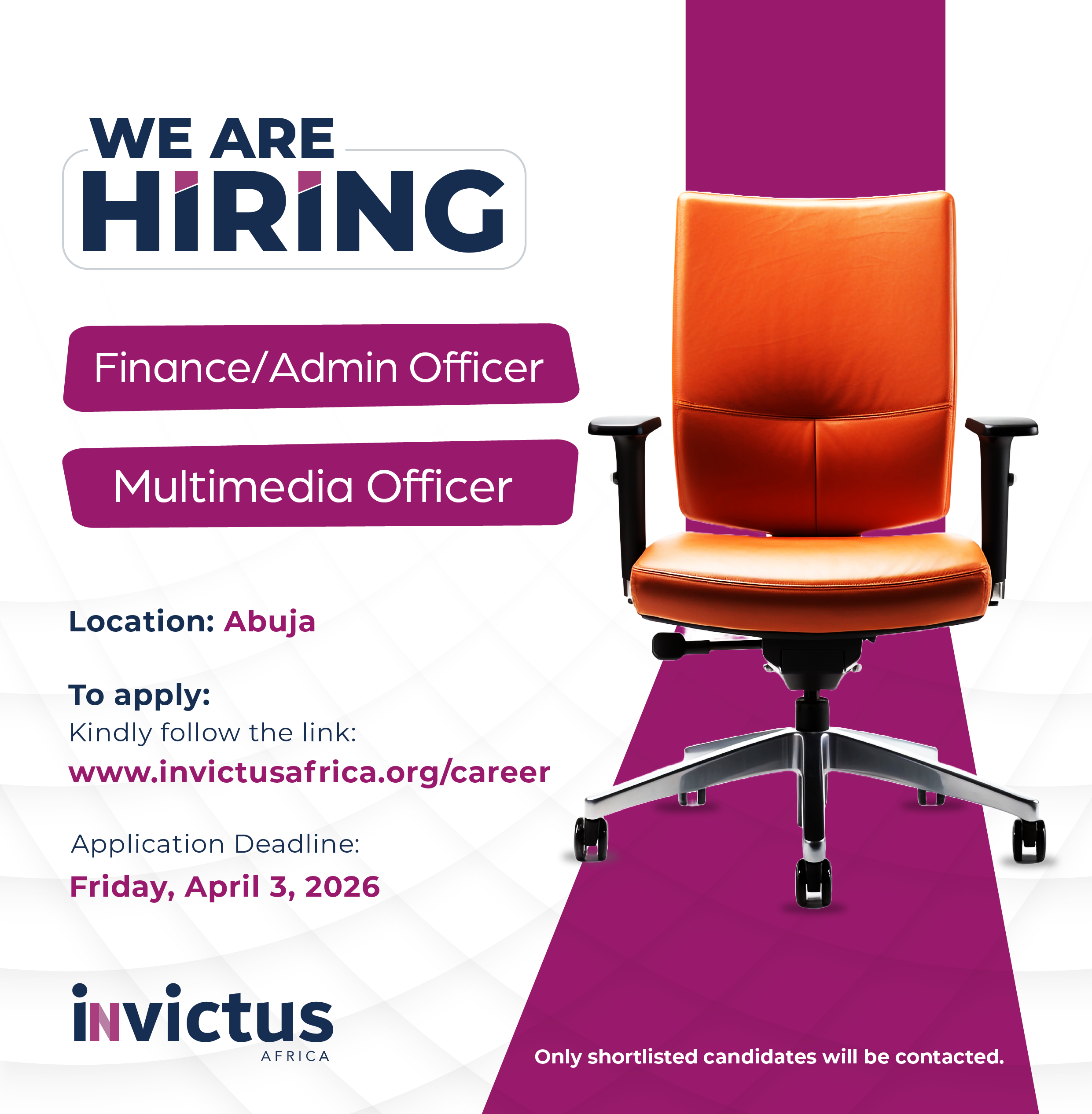 Invictus Africa offers the opportunity to work in a fun and vibrant environment with a young enthusiastic team of professionals to promote human rights and gender equality through data-driven advocacy, digital technologies, and capacity development.